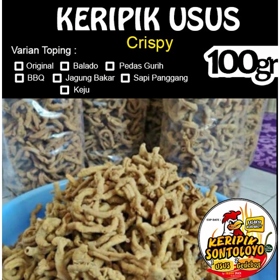 Berbahan dasar tepung pilihan dan usus ayam fresh, di goreng menggunakan minyak berkwalitas baik ,jaminan mutu tidak mengakibatkan batuk