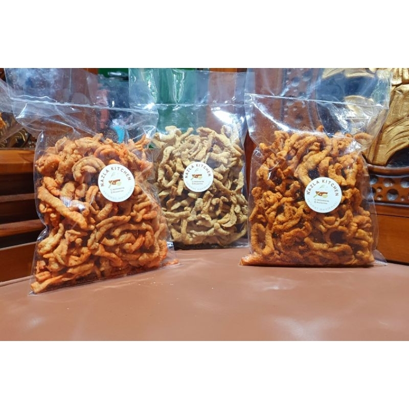 Keripik usus yang renyah dibalut tepung tipis. (harga belum termasuk plastik bubble)