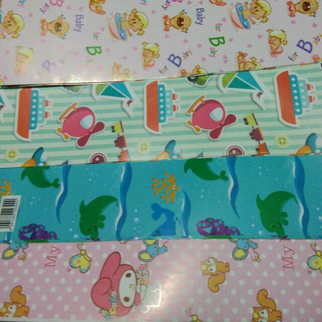 Kertas bungkus kado bahan glossy atau mengkilap, cocok untuk bungkus kado atau sampul buku, motif lucu lucu, setiap waktu motif tidak selalu sama, namun bahan kertas kado tetap sama