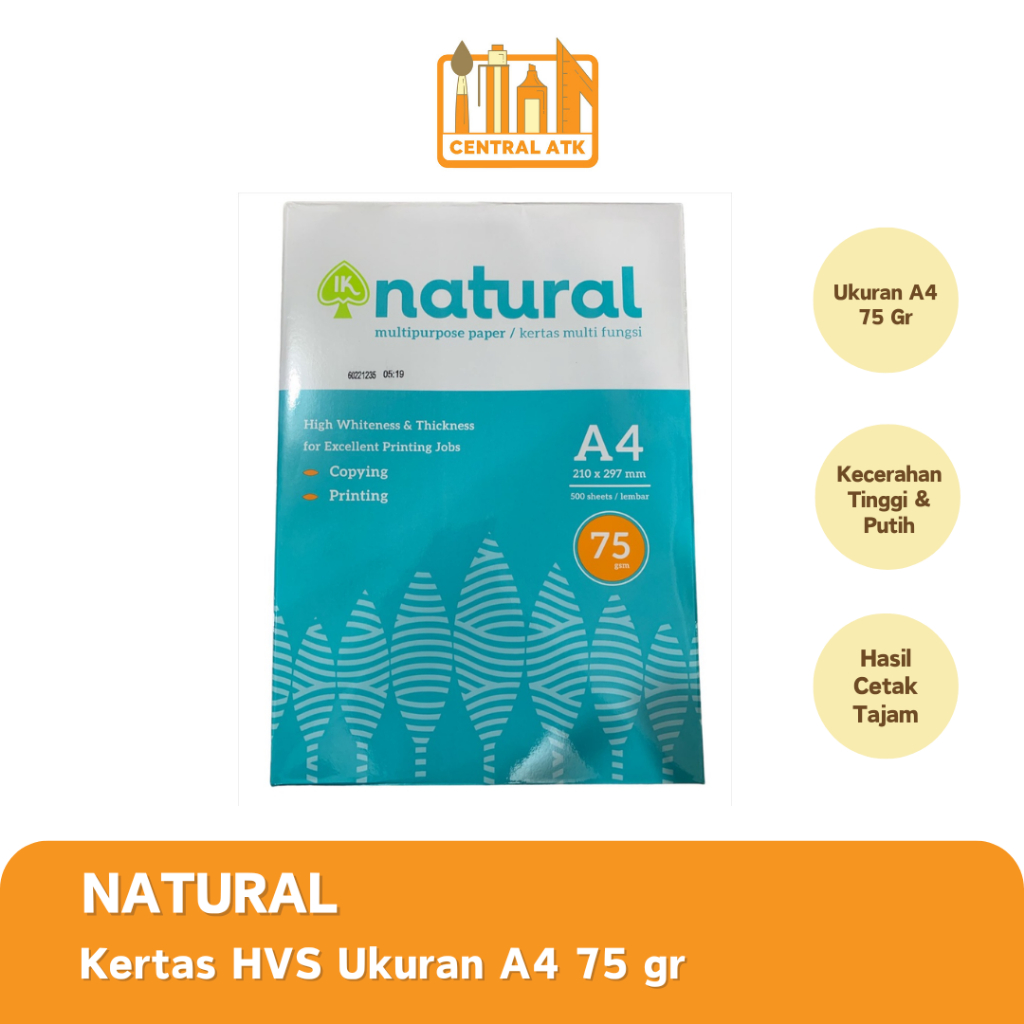 • HVS Natural adalah kertas fotocopy putih, berkualitas tinggi untuk penggunaan harian dan dapat di gunakan untuk keperluan Print, Fotocopy dan Fax.