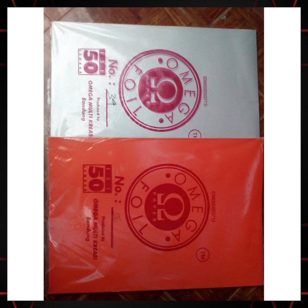 Kertas Omega Foil, kertas karton omega yang diproduksi oleh omega multi kreasi bandung. Ukuran kertas omega foil ini 40 x 60 cm dan warna kertas omega ini beraneka ragam seperti merah tua, pink, kuning tua, kuning muda, hijau muda, hijau tua, biru tua, biru muda, hitam, coklat dll.