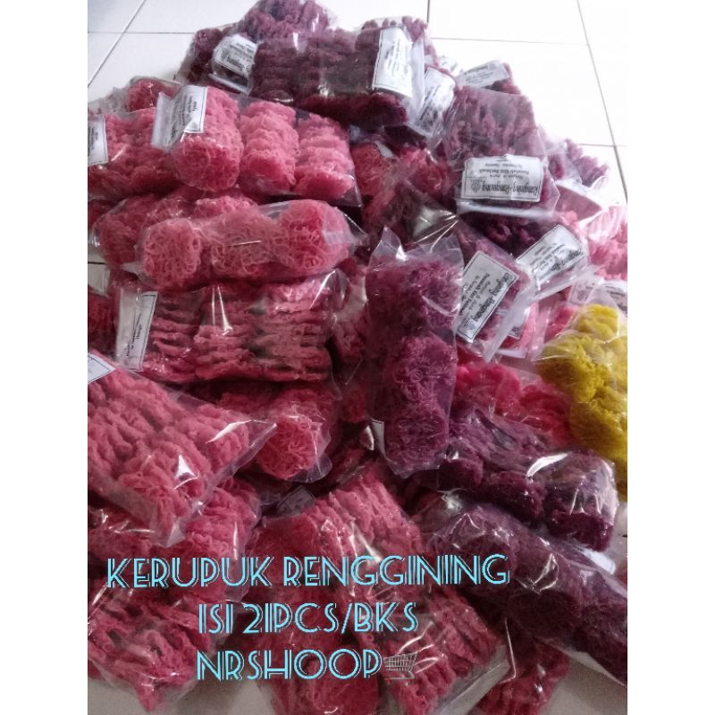 Kerupuk Renggining yang terbuat dari tepung beras dgn pewarna makanan yang terdaftar BPOM serta rasa gurih yang terbuat dari bawang putih juga renyah dari tepung beras dan tepung tapioka