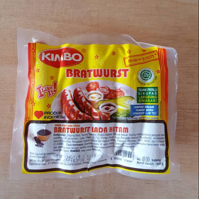 Produk Olahan daging dari KIMBO yang mempunyai bentuk sosis sapi rasa lada hitam yang tersedia dalam kemasan beku (frozen) dengan berat 500 gram