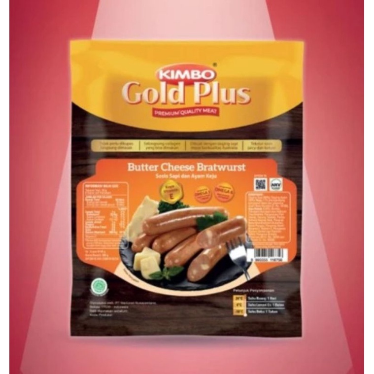 KIMBO Gold Plus Bratwurst Butter Cheese kaya akan VIT-E, OMEGA 3 dan OMEGA 6, yang berguna untuk memperkuat imunitas dan kekebalan tubuh. Sosis ini berukuran mini (cocktail) sangat cocok untuk dijadikan sate sosis bakar dengan tambahan bumbu BBQ, saus tomat, mayonaise atau jenis saus lainnya.