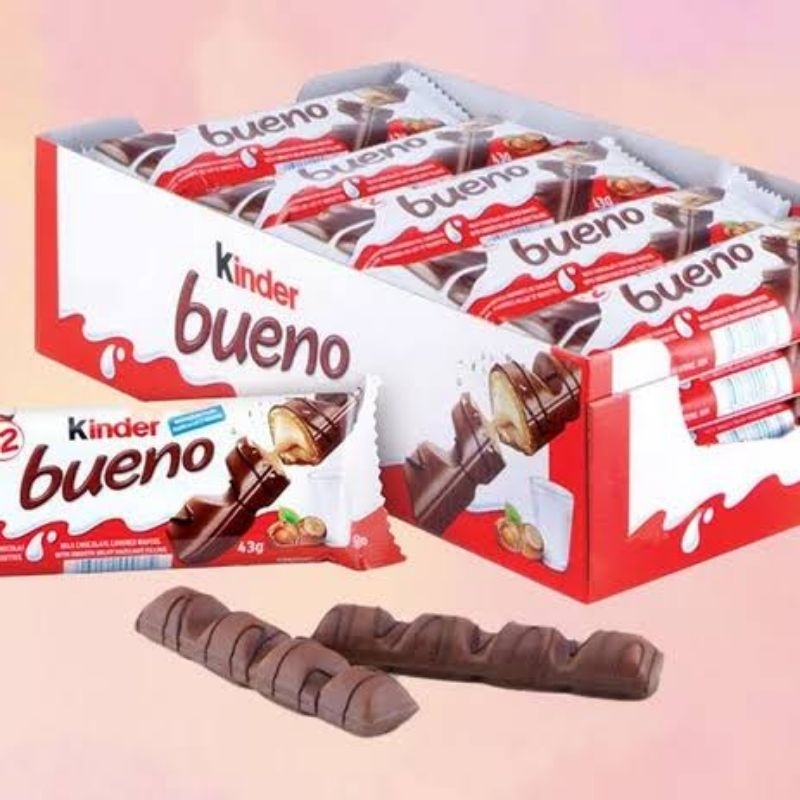 Nikmati kelezatan cokelat Kinder Bueno. Gabungan antara wafer ringan, krim hazelnut lembut, dan cokelat berkualitas tinggi yang akan membuatmu ketagihan!