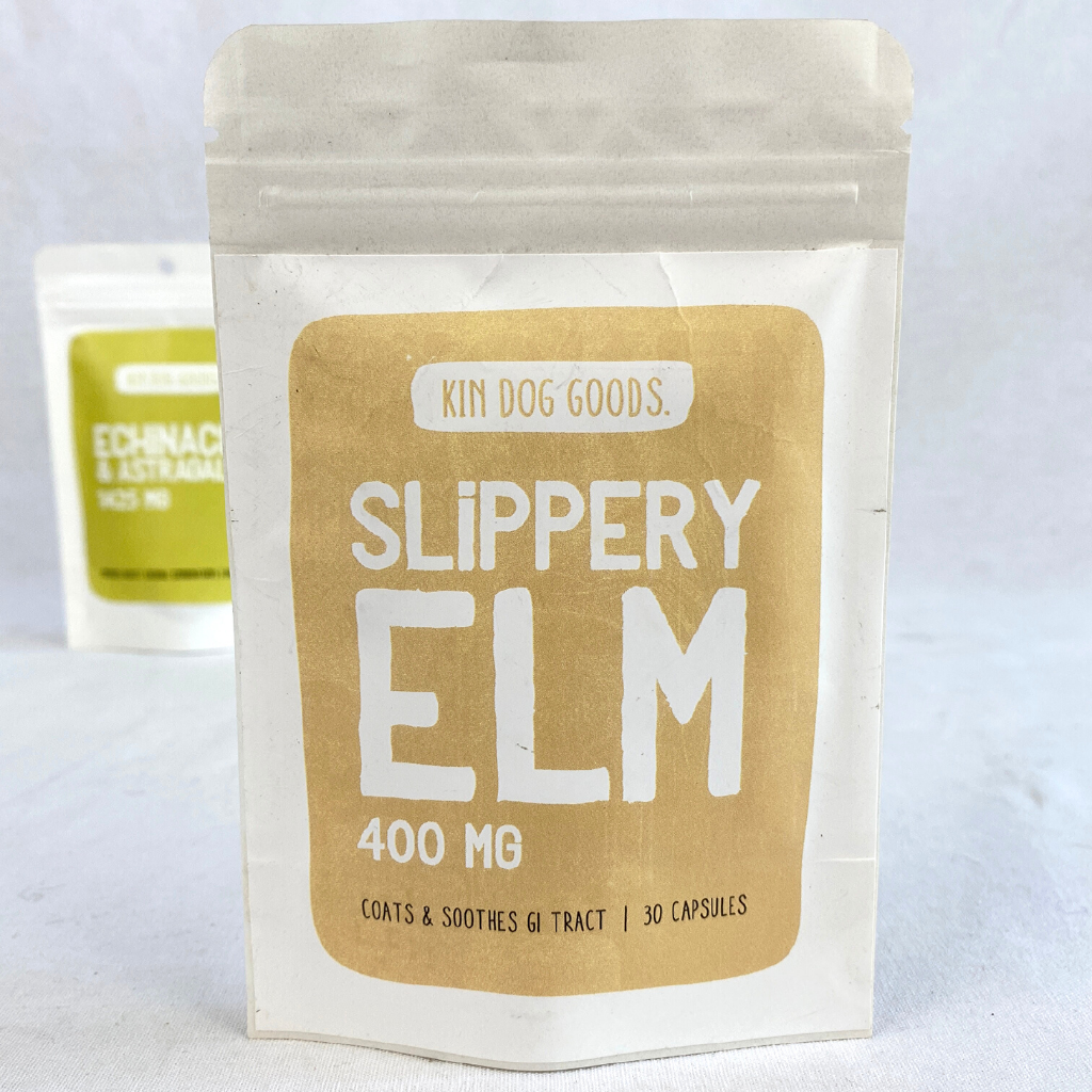 Kin Dog Goods’ Slippery elm works as a stomach soother; naturally coats andlubricates the stomach lining, settling it down in the process. As such,slippery elm is often used to address diarrhea, constipation, ulcers, colitis,gastrointestinal diseases & infl ammatory bowel disorders. Slippery Elm herb isalso highly nutritive, being a source of fi ber, biofl avonoids, calcium,magnesium, sodium, vitamins A, E, C, K and B-complex. On top of that, slipperyelm is also a prebiotic and helps promote balanced flora in the gut.• Internal Use: recommended for acute cases of diarrhea or constipation.• Cough Syrup : helps coat the upper respiratory system, making it of greatbenefi t in easing discomforts from painful coughing associated with conditionslike kennel cough and bronchitis.• Topical Wounds: makes an excellent paste to apply to external wounds your dogmay have, including boils, hotspots, burns, wounds, and skin inflammations.