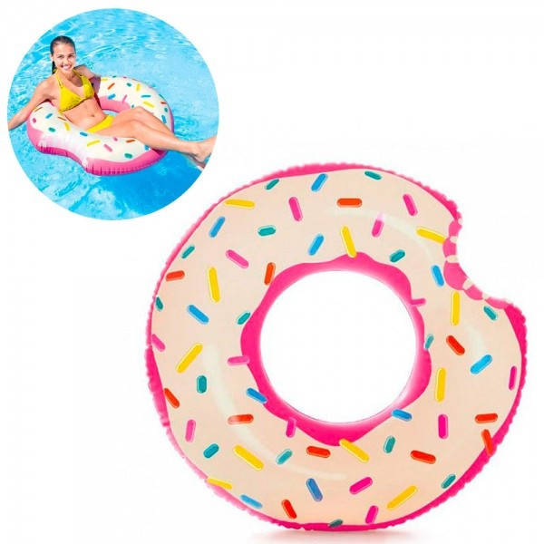 Круг Пончик, 107-99см, ремкомплект, 9+, в коробкеРозовый пончик в глазури и кондитерской посыпке — отличный пляжный аксессуар. Это не только симпатичный, но и удобный надувной круг, на котором вы можете как плавать, так и просто отдыхать на воде. Размеры: 107х99 см. Накачать его очень легко с помощью ручного насоса Intex.