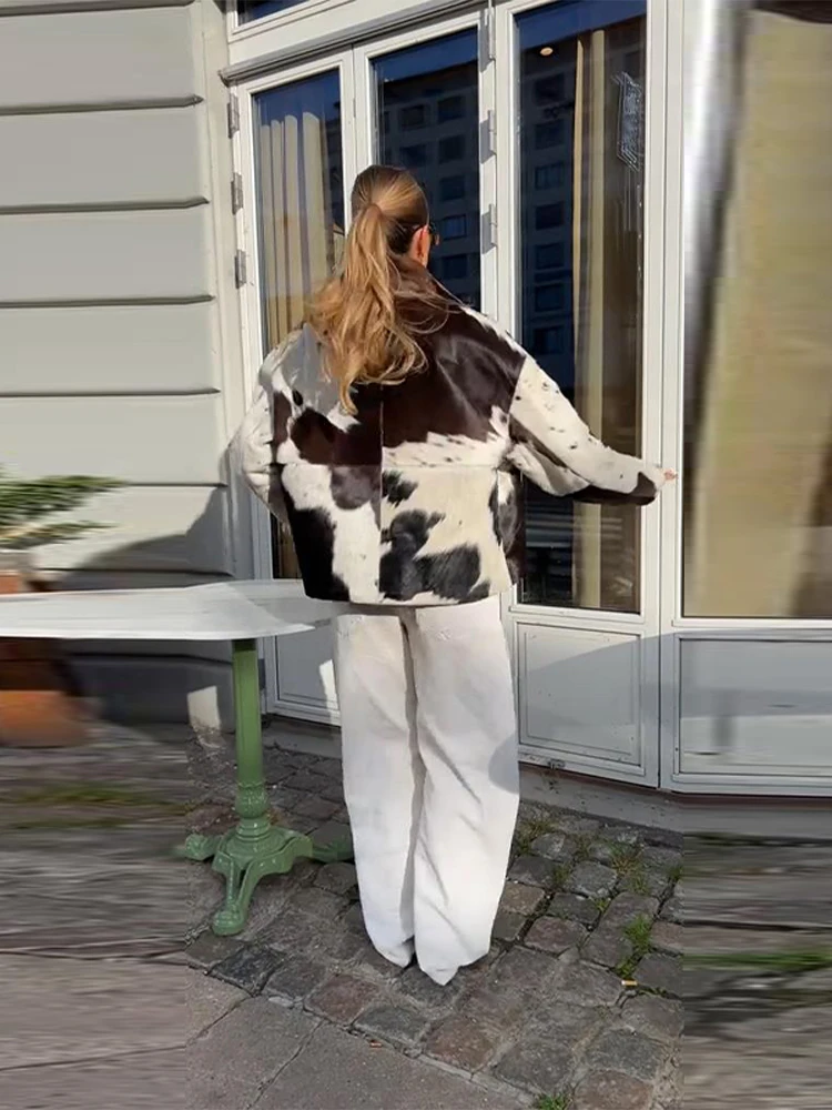 Women's Irregular Printed Jackets Cow Pattern Coats Standing Collar Zipper Jacket Autumn New Woman Clothes High Street Tops