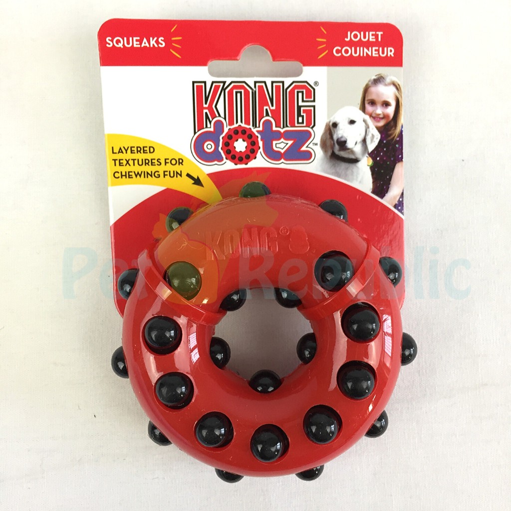 KONG Dotz provide a variety of chewing fun with layered textures that entice and delight the most eager of chewers. The playful,unpredictable bounce of the toy creates excitement for dogs while the nubs are busy cleaning teeth and gums.Layered textures provide a variety of chewing funUnpredictable bounce creates excitementNubs clean teeth and gumsAvailable in sizes: XS, S, and L