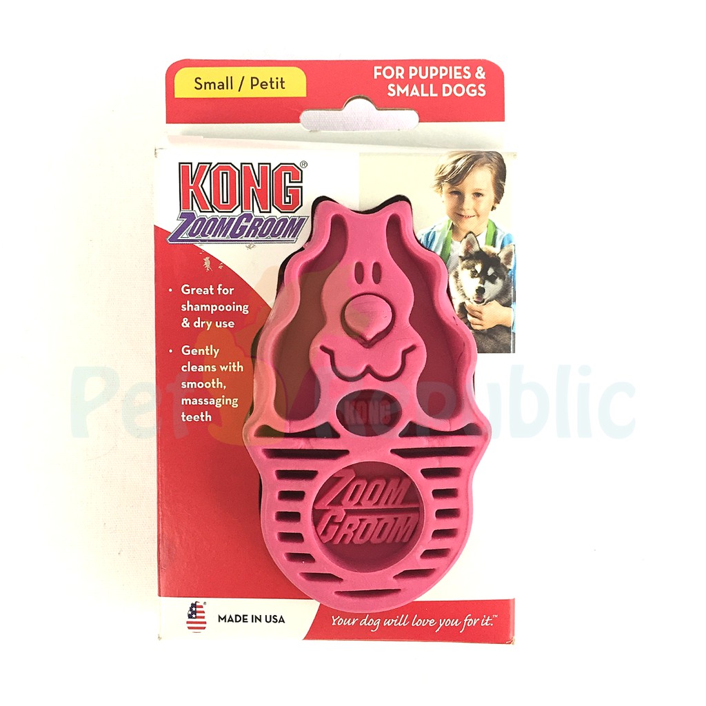 DescriptionThe KONG ZoomGroom is the best grooming and shampooing brush available. Itremoves loose hair like a magnet, and it stimulates capillaries and natural oilproduction for healthy skin and a healthy coat.Key Benefits2-in-1 tool that massages your dog while you brush and keeps your pet engagedGreat for bath use with shampoo, and brushing afterwards to give the coat asmooth and shiny finishSmall/Puppy size ideal for puppies and small breeds. Regular size ideal formedium to large sized breeds. Suitable for all coat typesMade in the USA from globally sourced materialsRegular grooming with Zoomgroom effectively removes loose hair like a magnet andreduces shedding around the house. Its design stimulates capillaries and naturaloil production for healthy skin and a healthy coatInstructionsBrushing: Brush gently in a circular motion in your dog's fur.Bathing: Apply shampoo to the ZoomGroom. In a circular motion, glide theZoomGroom through wet hair. Rinse.
