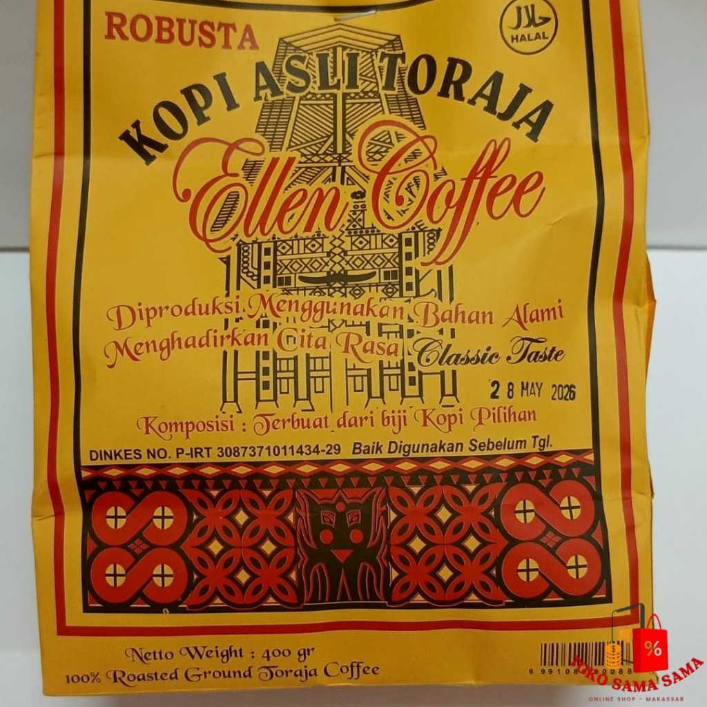 Kopi Toraja Ellen Coffee adalah kopi Toraja asli yang diproduksi di Makassar, Sulawesi Selatan. Kopi ini memiliki aroma khas yang berbeda dengan kopi lainnya dan cocok dijadikan oleh-oleh khas Makassar. Kopi Toraja Arabika dari Ellen Coffee, khususnya, dikenal dengan rasa yang kompleks, seimbang, dan kaya dengan sentuhan earthy, dark chocolate, dan fruity.