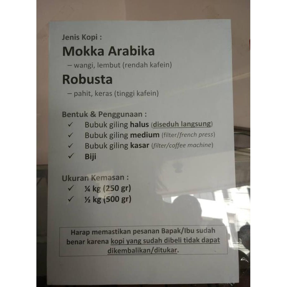 - Cantumkan tingkat penggilingan HALUS / MEDIUM / KASAR / BIJI pada saat pemesanan.