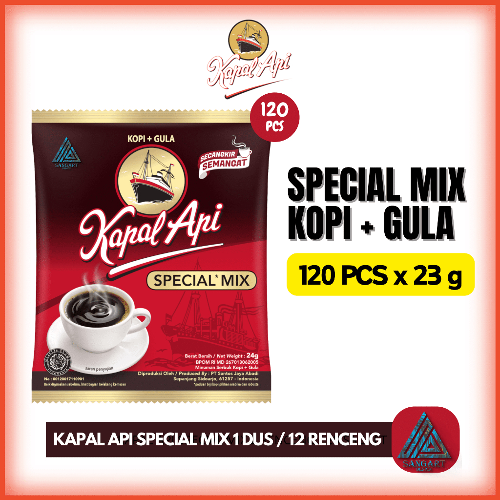 Kapal Api Special Mix Dibuat dari Biji kopi pilihan yang diolah menggunakan mesin yang paling modern & campuran gula murni. Menjadikannya paduan spesial dari kopi dan gula. Kemasan Praktisnya, membuat kopi anda siap seduh dengan aroma kopi senikmat selera pilihan.