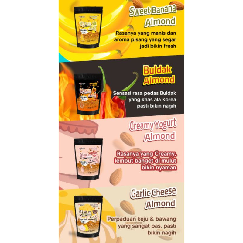 Rasakan gurihnya cemilan Roasted Almond ala Korea dengan berbagai macam varian rasa yang unik, renyah, halal dan nikmat untuk menemani Drama Korea favoritmu.