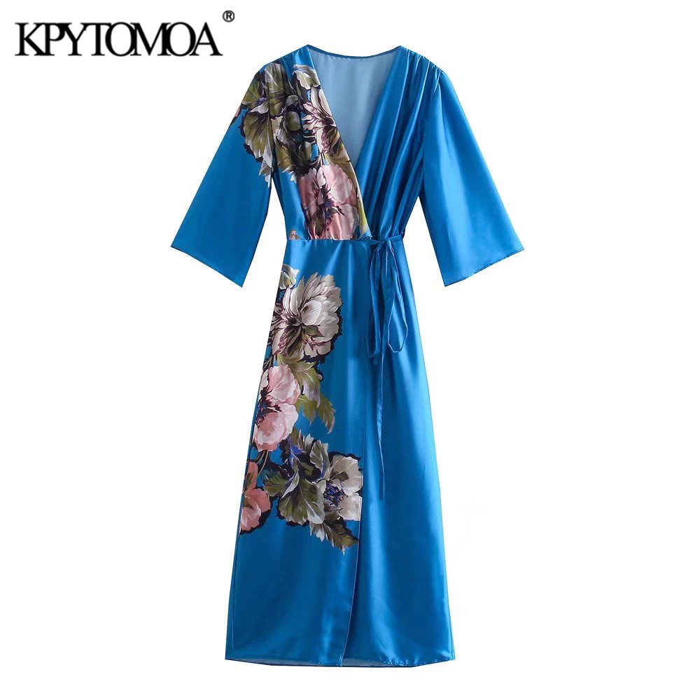 KPYTOMOA женское модное с завязывающимся цветочным принтом платье миди Винтажное с V-образным вырезом и коротким рукавом женские платья Vestidos ...