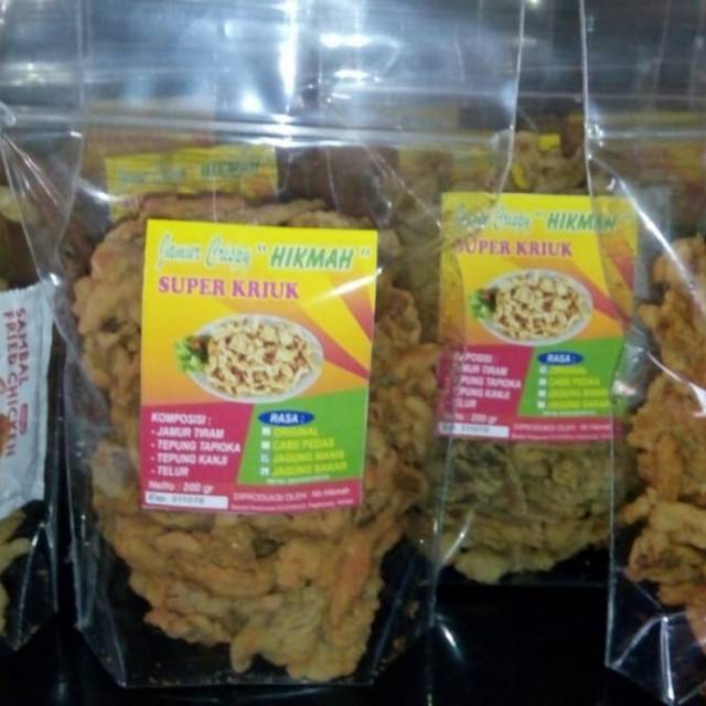 Makanan cemilan terbuat dari jamur tiram yang masih segar dan pilihan . Proses kami buat dengan cara masih tradisional dan tetap memperhatikan kebersihan ... Berbagai macam varian rasa : original , cabe pedas dan jagung bakar dengan berat 200 gram ....