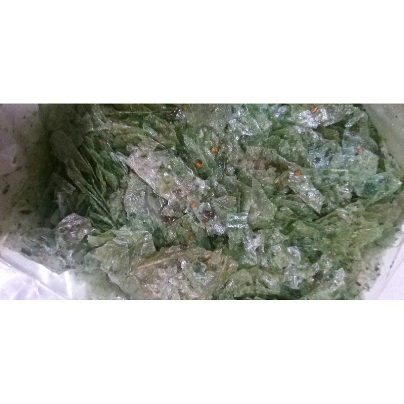 Keripik kaca dibalut bumbu rumput laut pedas yang gurih pedas dan nikmat.