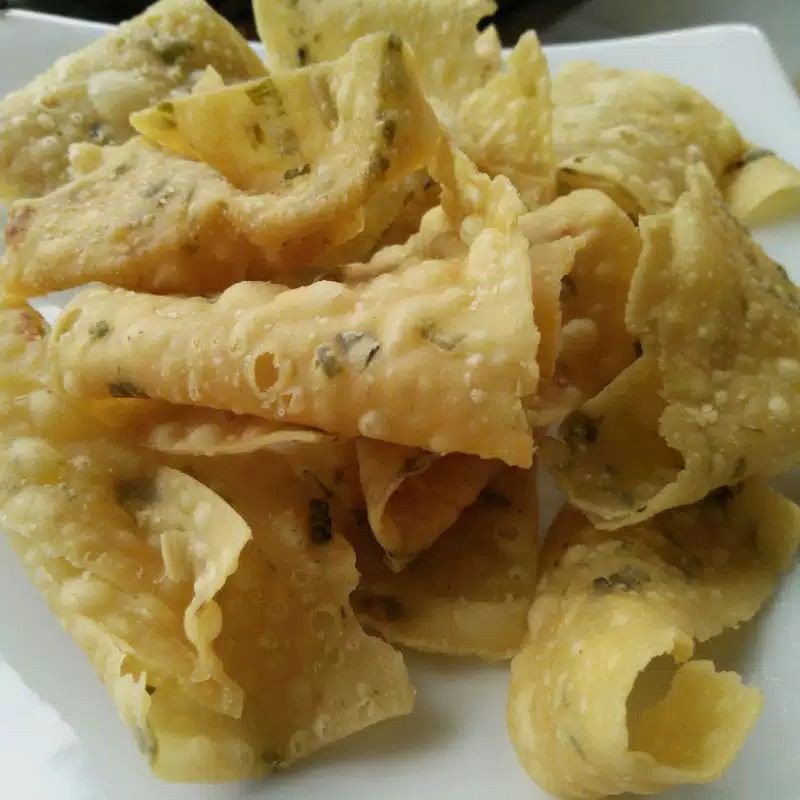 Terbuat dari potongan daun bawang dan tepung terigu.