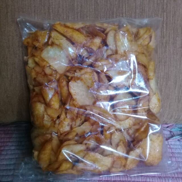 Kripik singkong makanan ringan untuk santai rasa pedas renyah dimakan, empuk, lezat, gurih