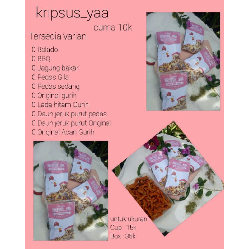 Mimin rekomendasikan niiih buat kamu cobain, camilan keripik usus ayam yang satu ini. Olahan yang dari yang terbuat dari bahan dasar usus ayam yang mempunyai kualitas yang terbaik, lalu diolah secara higenis, sehingga menjadi kripik usus yang layak di konsumsi dan rasanya top buangud buat dikonsumsi tiap hari. dan banyak varian rasa yg baru