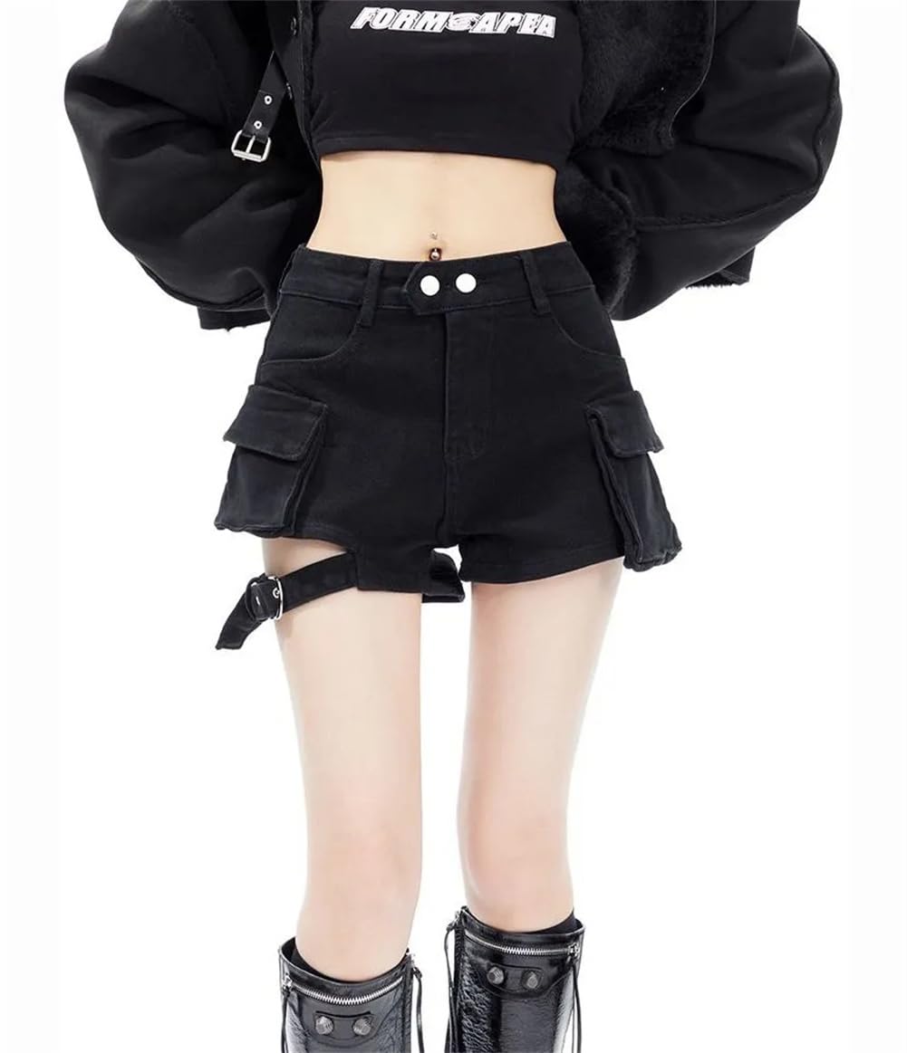 KSLAT Джинсовые Горячие Карго Подвязки Высокая Талия Корейский Военный Стиль Женские Шорты, Брюки, Брюки, Джинсы, Талия, А-силуэт, Стиль, Повседневный, Лето, Сексуальный, (черный) чёрный