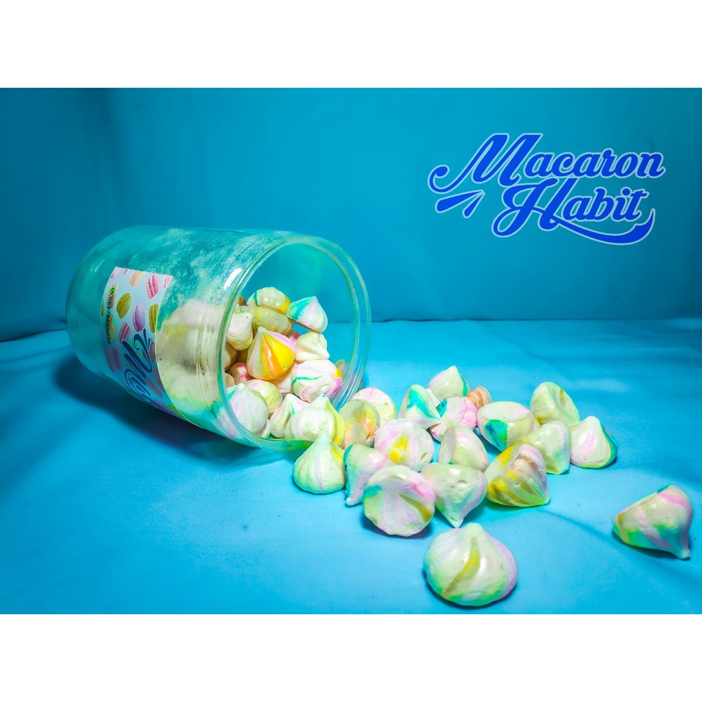 Kue meringue satu toples kecil rasa dan warna mix, ada berbagai macam varian rasa. Rasa buah-buahan, vanilla, coklat, moca, greentea dll