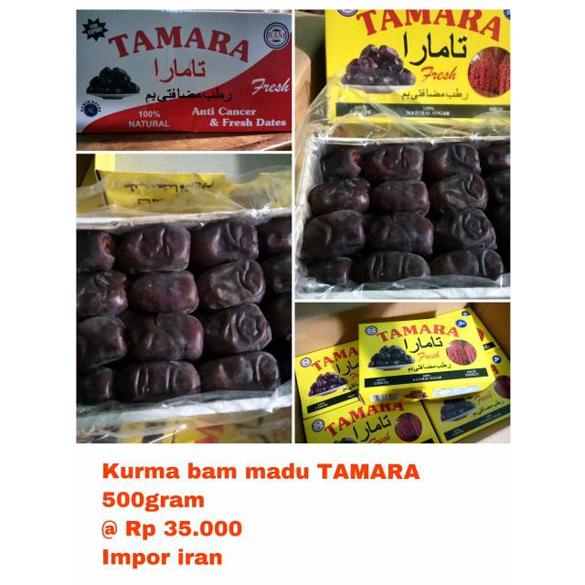 Kurma Bam Tamara berasal dari Negara Iran. Tekstur kurma Bam Tamara lembut dan basah. Ukurannya agak besar dan berwarna kehitaman. Kurma Bam juga sering disebut kurma madu/anggur Dengan kemasan 650 gram, kurma Bam Tamara cocok digunakan sebagai camilan, oleh oleh haji dan umroh, juga sebagai hadiah untuk orang-orang tercinta.