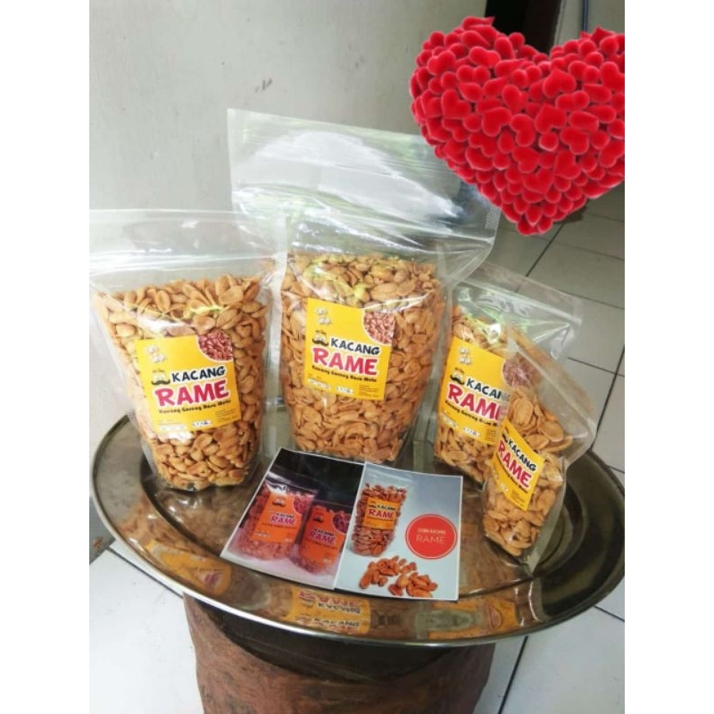 kacang Rame Kacang goreng yang memiliki rasa seperti kacang mete, sangat cocok untuk menemani hari-hari anda disaat sendiri maupun disaat berkumpul. Dengan harga yang terjangkau anda bisa menikmati rasa kacang yang membuat anda ketagihan dengan resep rahasia tersendiri. Tahan sekitar 1 bulan setelah pembelian selama kemasan belum dibuka dan untuk penyimpanan dapat ditempatkan di tempat kedap udara agar kacang tetap garing.