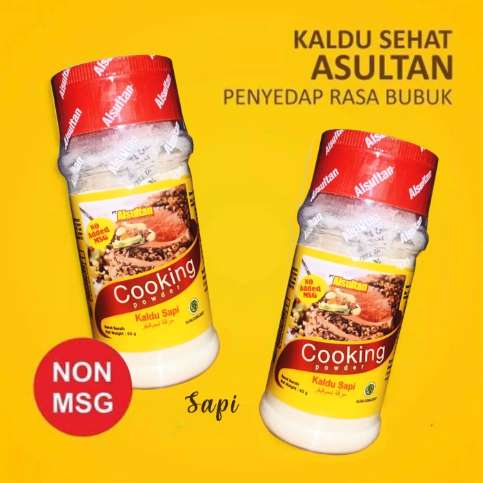 Kaldu Alsultan merupakan penyedap masakan yang tidak mengandung vetsin/MSG (Monosodium Glutamat). Bahan2 yg digunakan adalah campuran rempah-rempah khas Indonesia, karenanya menjadikan masakan anda lezat, sehat dan aman dikonsumsi siapapun.