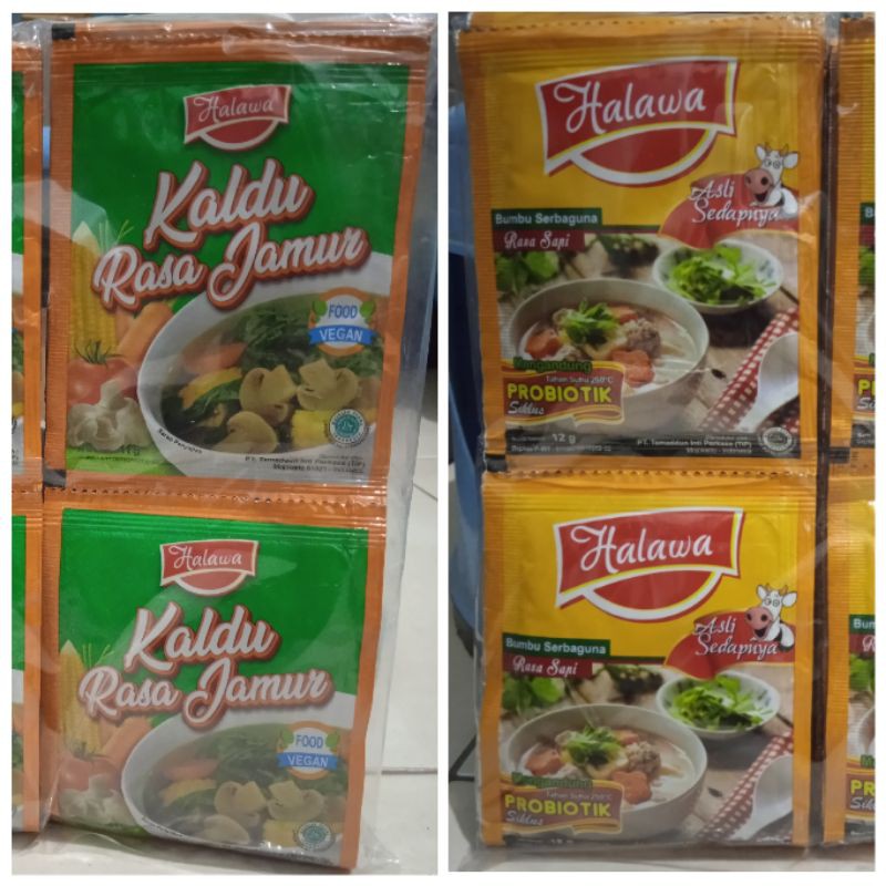bumbu penyedap halawa menggunakan jamur, sapi yang terbaik (bukan perasaan buatan), tanpa bahan pengawet, kaya akan probiotik yang baik bagi tubuh, kaya akan rempah-rempah kualitas premium, di produksi dengan sistem produksi standart modern, bisa digunakan untuk berbagai menu masakan termasuk menu masakan berkuah, tumisan juga gorengan dan yang pasti aman sehat untuk keluarga tercinta kita.