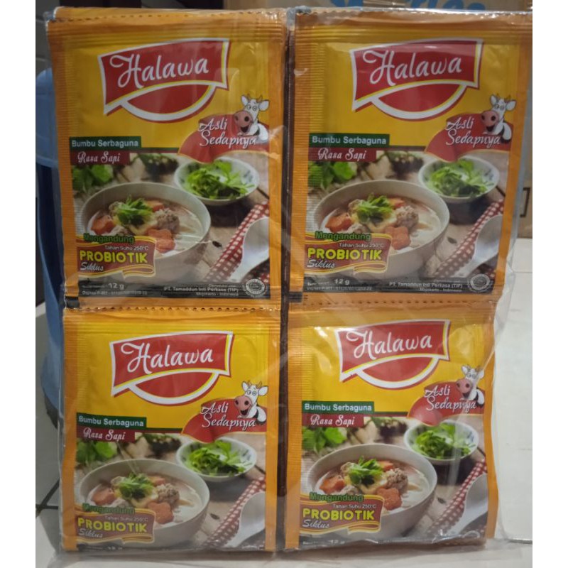 bumbu penyedap halawa menggunakan daging sapi yang terbaik (bukan perasaan buatan), tanpa bahan pengawet, kaya akan probiotik yang baik bagi tubuh, kaya akan rempah-rempah kualitas premium, di produksi dengan sistem produksi standart modern, bisa digunakan untuk berbagai menu masakan termasuk menu masakan berkuah, tumisan juga gorengan dan yang pasti aman sehat untuk keluarga tercinta kita.