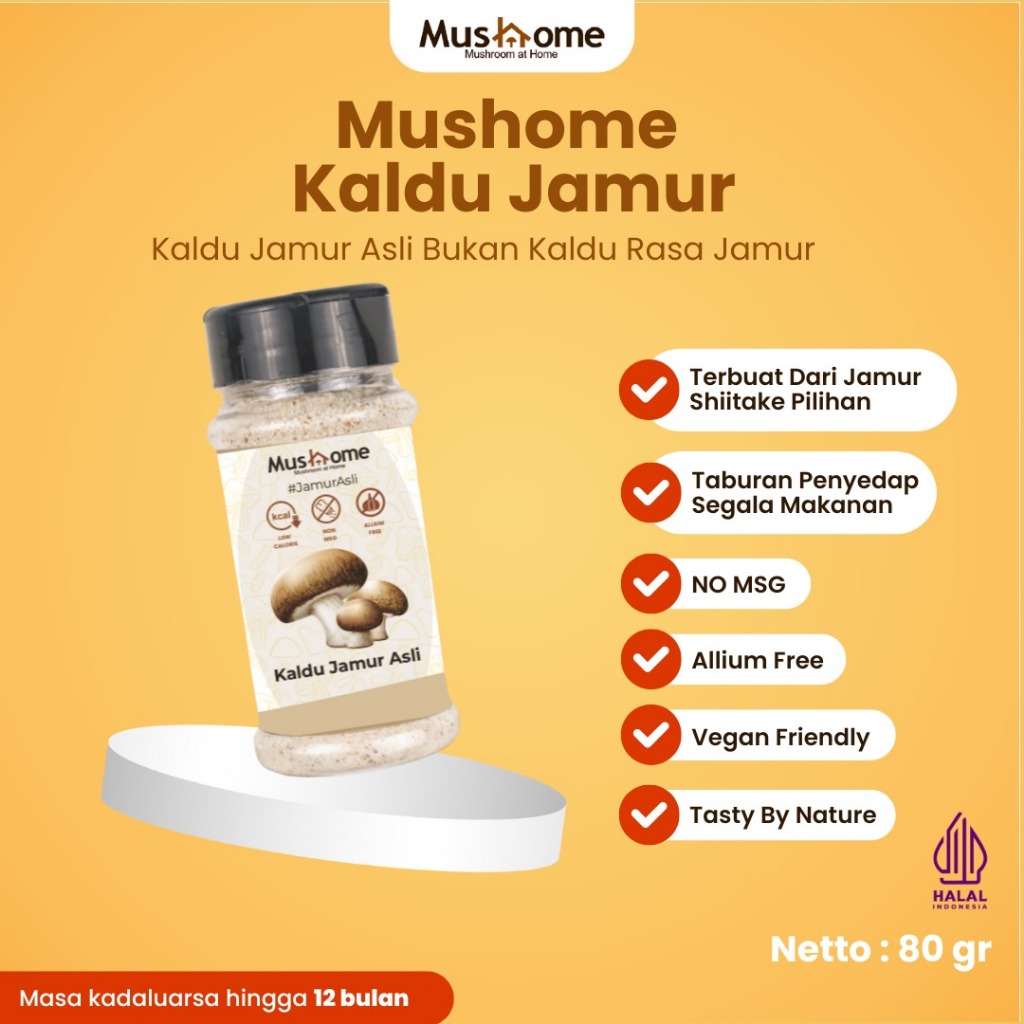 Kaldu Jamur Mushome terbuat dari jamur asli yang dipetik langsung dari perkebunan di Jawa Barat, dikeringkan dan dipadukan dengan rempah pilihan. Rasakan gurih alami yang lembut, jauh dari rasa tajam MSG.