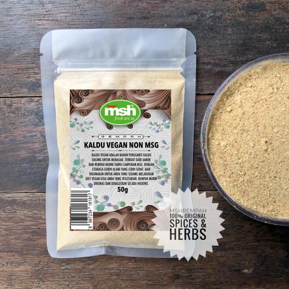 Kaldu vegan adalah bahan pengganti kaldu daging untuk memasak. Terbuat dari jamur dan rempah murni tanpa campuran MSG. Dengan citarasa gurih alami yang lebih sehat. Baik digunakan untuk anda yang sedang melakukan diet vegan atau anda yang vegetarian. Rempah murni dikemas dan dihaluskan secara higienis.