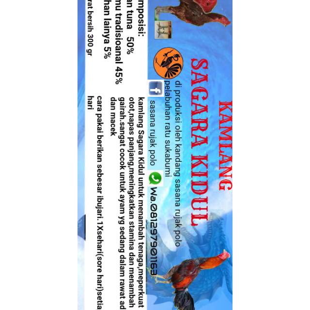 Kamlang sagara kidul memudahkan merawat ayam aduan.tinggal colek lolohkan.manfaat. menambah tenaga.memperkuat otot.napas panjang.meningkatkan stamina.agressif.cepat merah merona.cocok untuk ayam dalam masa rawat adu n macek.