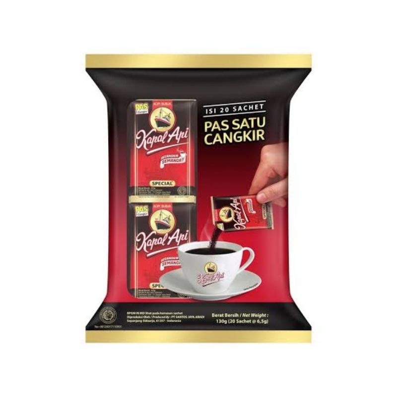 Kapal Api Special 20 Sachet x 6gr,, Kopi Kapal Api Special Tanpa Gula dengan Takaran Pas 1 Cangkir untuk setiap Sachet nya. Ngopi jadi lebih Praktis Hemat dan yang pasti Takaran yang Pas.
