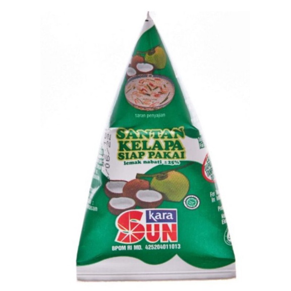 Kara Sun Santan TCA 65 ml merupakan santan kelapa siap pakai yang terbuat dari air kelapa yang dikukur. Santan Kara Sun diolah dan dikemas secara modern dan higienis menggunakan sterilisasi tinggi (UHT) sehingga kesegaran dan keaslian santan terjaga dengan baik, serta membuatnya tahan disimpan dalam waktu lama di dalam kulkas. Mengandung lemak nabati kurang lebih 25%, juga dibuat tanpa pengawet sehingga aman digunakan.