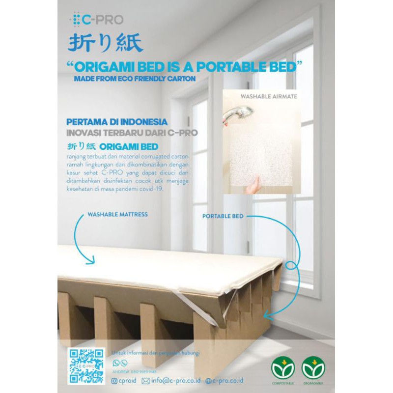 Ranjang terbuat dari material corrugated carton, ramah lingkungan dan dikombinasikan dengan kasur sehat C-PRO yang dapat menjaga kesehatan anda.