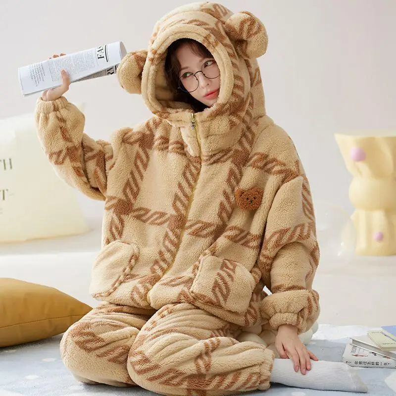 Kawaii осенне-зимний пижамный комплект для девочек, пижамы с героями мультфильмов, милая ночная рубашка, сохраняющая тепло, домашняя одежда, коралловый флис, утепленная одежда для сна на молнии с капюшоном
