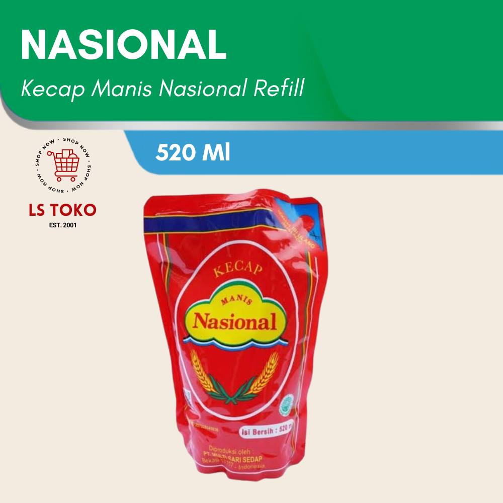 Kecap Manis Nasional Refill 520 mlKecap manis yang terbuat dari bahan alami pilihan seperti kedelai, gandum dan gula merah berkualitas. Kecap ini hadir dalam kemasan pouch yang praktis untuk memudahkan Anda dalam menyajikan hidangan istimewa dengan rasa yang nikmat.
