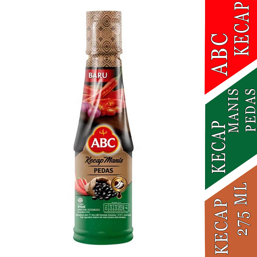 ABC Kecap Pedas 275 ml Kecap Pedas ABC, terbuat dari perasan pertama kedelai pilihan. Untuk masakan yang lebih kaya rasa, siapapun yang masak. Kecap ABC, disukai oleh 9 dari 10 ibu di Indonesia. Detail: - Perasan Pertama Kedelai Pilihan - Lebih Kaya Rasa - Lebih Kental & Hitam Komposisi: Gula, sari kacang kedelai 12% (mengandung gandum 0.6%), air, garam, pewarna alami karamel III dan IV, pengawet natrium benzoat,penstabil nabati, pengatur keasaman