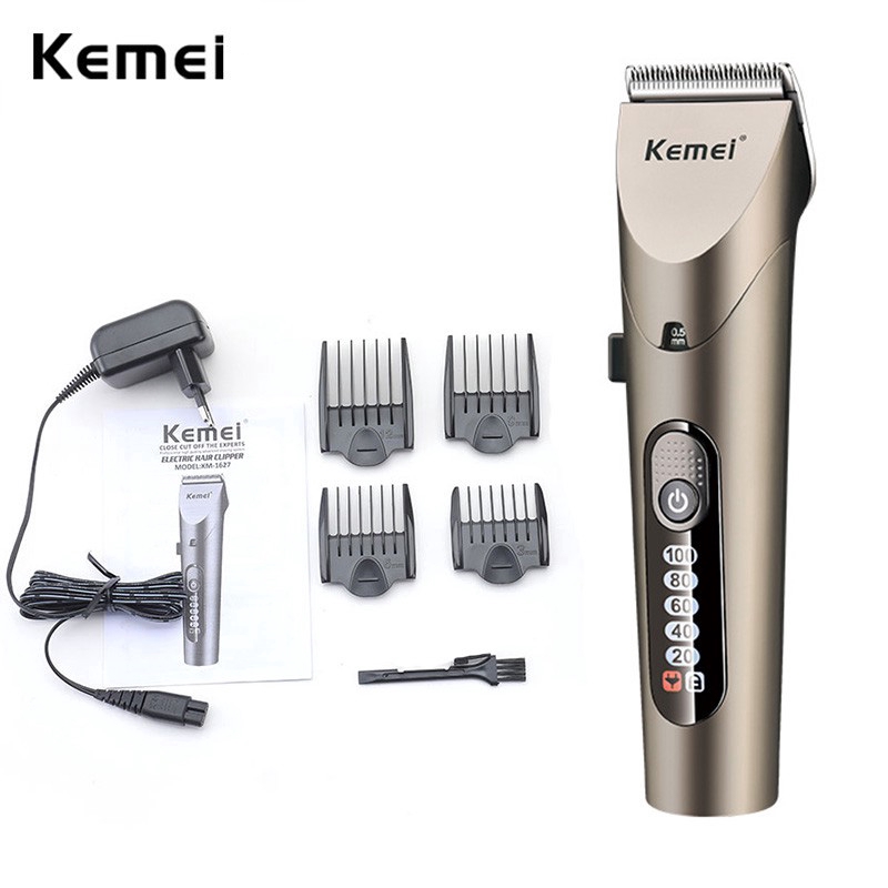 Specifications:Item Type : Hair TrimmerBrand Name : KemeiMaterial : ABSSize : EU plug, rechargeableModel Number : KM-1627, kemei 1627Commodity Quality Certification : ceVoltage : 100-240VPower : 5WCharging time : 1.5 hoursWorking time : 150 minutesFeature-1 : LED display screenFeature-2 : sharp stainlessFeature-3 : 0.5/1/1.5/2mm fine-tuningFeature-4 : adjust the clipper cutting lengthFeature-5 : 3/6/9/12mm cutting guardsFeature-6 : WaterproofFeature-7 : detachable bladeFeature-8 : Low noiseFeature-9 : home, adult, baby, barber, salonIntroduction:adjustable blade length in the middle of fuselagehigh precision cutter head for accurate hair removal, 5W big power motoreach operation can be cut 25% more hairadvance contur following system charging indicatormagic stainless steel blade cut hair very easysliver PD alloy motor of high rotational speedFeature:it is simple, easy for a variety of styles, use for any agesimport sercurity cutting headKEMEI NEWPackage:1x Machine4x Limit comb(3/6/9/12mm)1x Manual1x Brush1x chargerthe oil bottle will not be included, this is because of the air shipping limitation, oil is not safe for air shipping, please understand us, thank you so much!