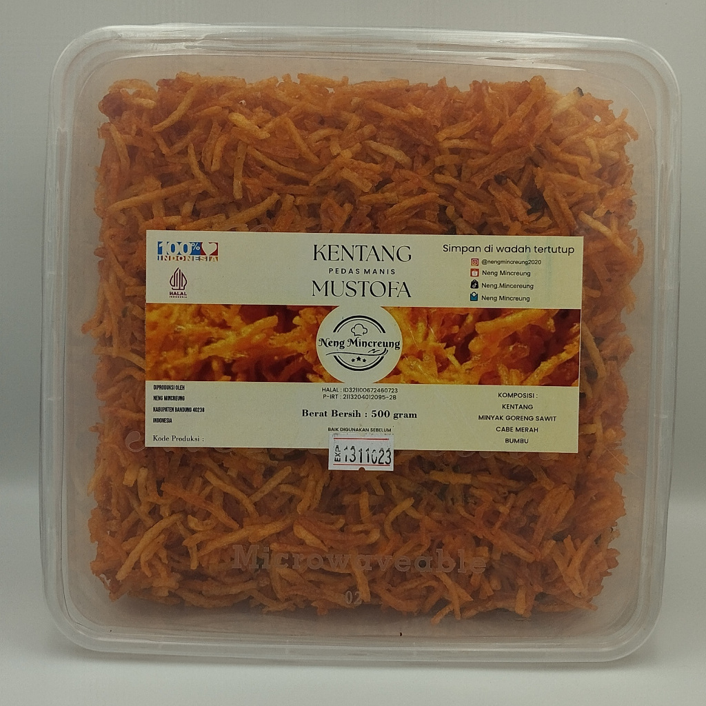 Kentang mustofa Neng Mincreung terbuat dari kentang Dieng pilihan dengan citarasa khas Pasundan, gurih, kriuk dan tanpa bahan pengawet. Tersedia dalam tiga kemasan (100 g, 250 g dan 500 g).