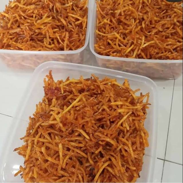 Kentang krispi atau kentang Mustofa sangat cocok untuk cemilan dan teman makan, tersedia berbagai rasa, original, balado, teri, ebi dan jengkol.