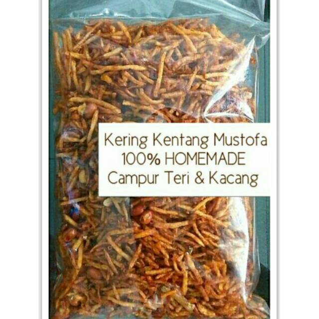 Kami memproduksi Kering Kentang atau biasa disebut Mustofa. Dibuat dari Kentang Asli dengan bumbu pilihan serta tambahan Kacang Goreng dan Ikan Teri Medan. Sangat cocok untuk Santap Makan Siang di kantor, Cemilan ataupun bekal saat bepergian. Sangat Simple dan mudah dibawa karena dalam kemasan Toples.