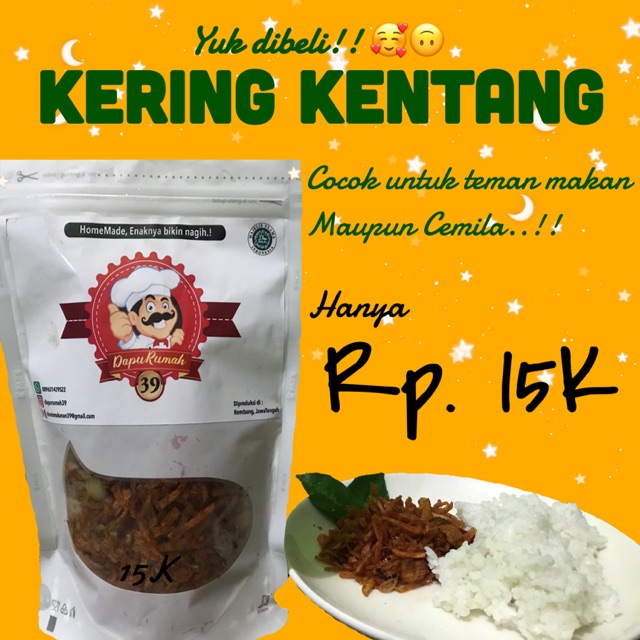 Kering Kentang ini dibuat dengan home made dengan kualitas renyah dan gurih tidak keras, 100% bahan alami tanpa pewarna dan pengawet, yuk dibeli bisa untuk teman makan maupun cemilan, tersedia rasa pedas dan tidak pedas ya