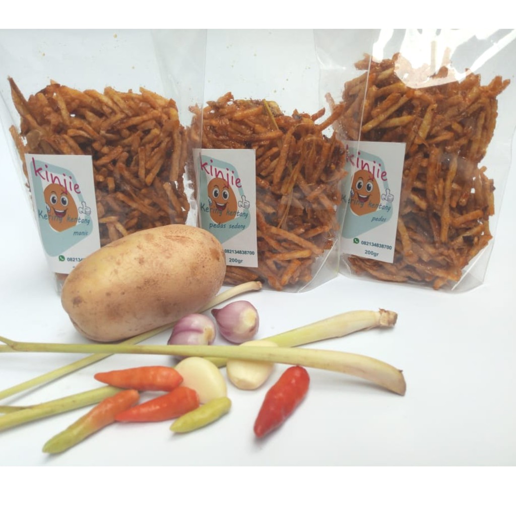 Kinjie kering kentang terbuat dari kentang pilihan segar, diiris dan dipotong bentuk korek api lalu diracik dengan bumbu special khas Kinjie.