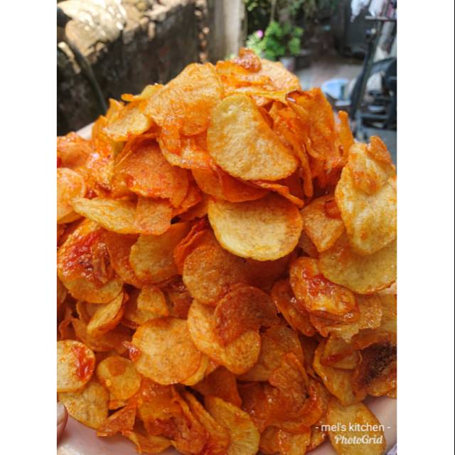 Keripik Kentang dengan bumbu manis pedas. Terbuat dari kentang asli. Tanpa pemanis buatan, tanpa pewarna dan tanpa MSG.