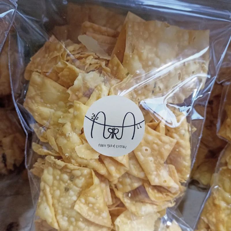Keripik dari Pangsit yang di goreng kering dan kriuk, cocok untuk teman makan Mi Rebus atau Baso dan Mi Ayam.. di Cemilin juga enak banget lho
