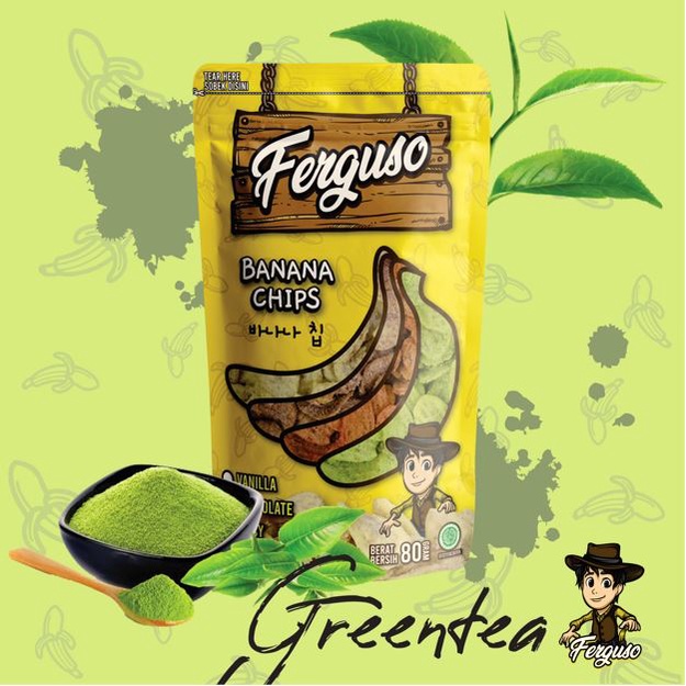 Keripik pisang Ferguso dari pisang pilihan yang di iris tipis dan di balur bumbu Greentea tebal untuk hasil rasa yang bikin nagih.