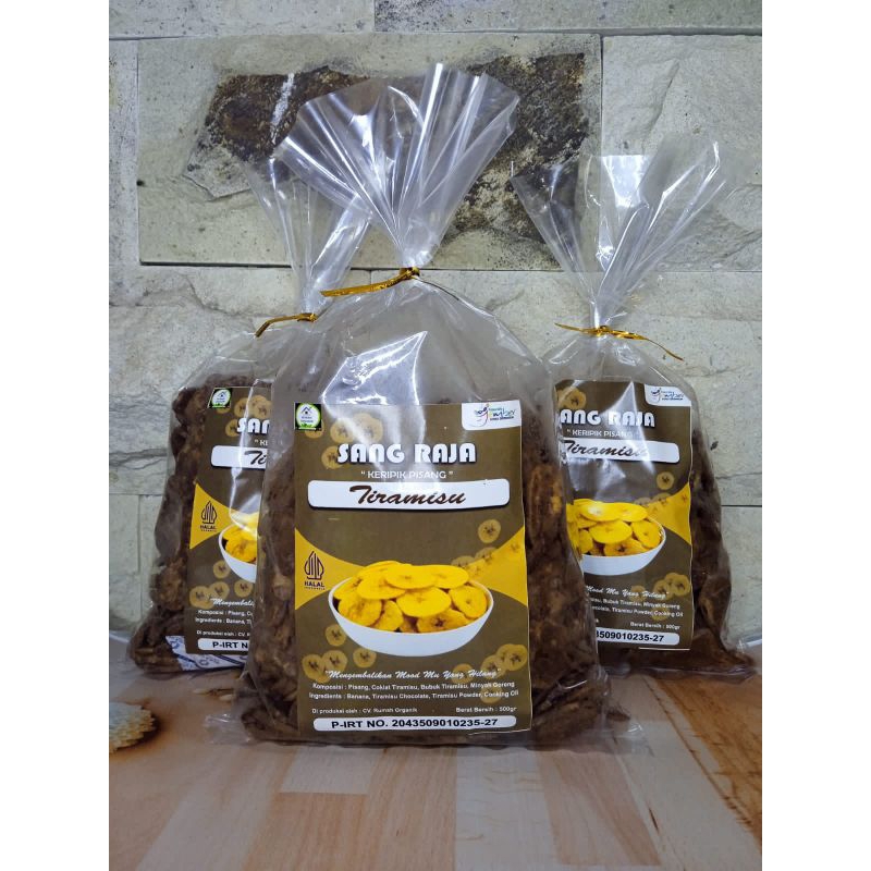 keripik pisang coklat tiramisu berbentuk kering bukan lumer.